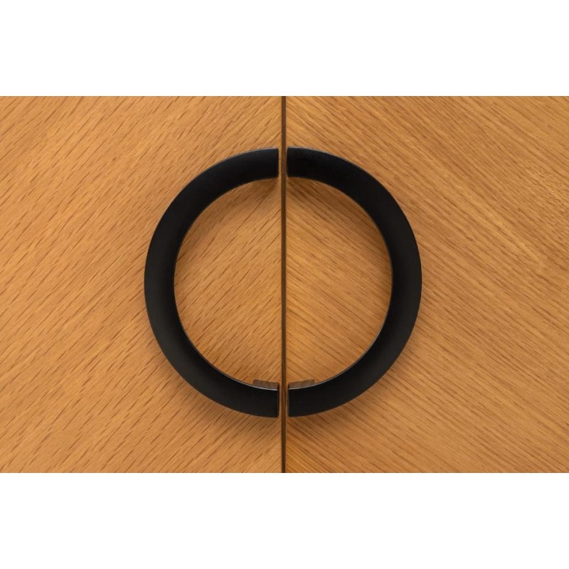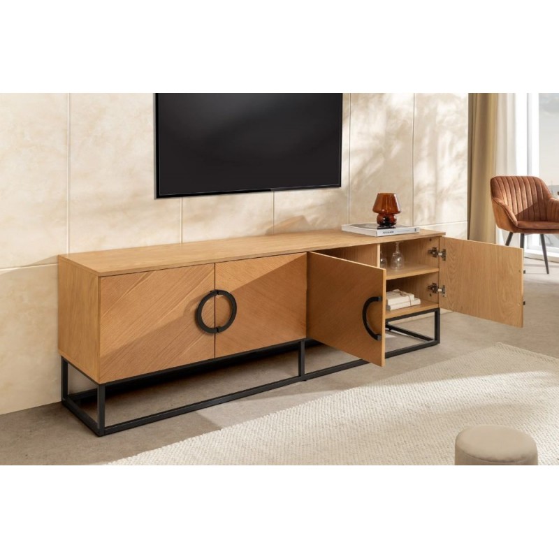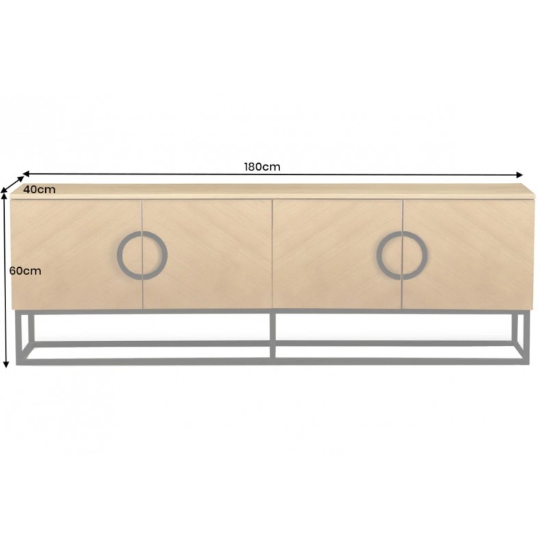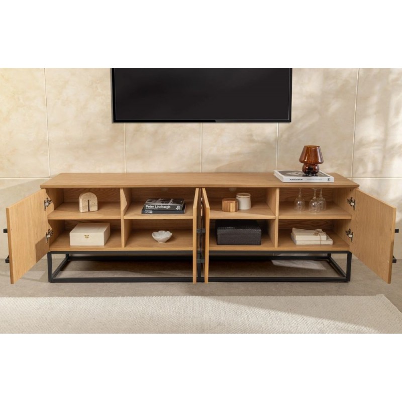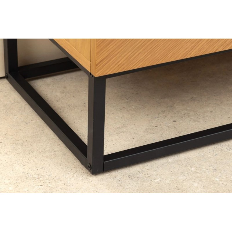 Ta elegancka szafka RTV idealnie wpisze się nie tylko w klasyczne, ale także minimalistyczne nowoczesne wnętrze. Wykonano ją z płyty MDF z dekorem drewnianym oklejonym imitacją dębu oraz osadzono na stabilnej czarnej metalowej podstawie. Dzięki swojej smukłej linii całość mebla wspaniale komponuje się z podstawą utrzymaną w ciemnej tonacji, a zastosowane na froncie uchwyty w kolorze czarnym nadają jej wyjątkowego, współczesnego charakteru. Posiada cztery podwójne pojemne półki z zamykanymi drzwiczkami, które bez wątpienia pomieszczą rzeczy codziennego użytku np: książki, dokumenty oraz urządzenia elektroniczne oferując tym samym dużą powierzchnię do ich przechowywania. Zaletą tej szafki RTV jest funkcjonalność, wytrzymałość oraz łatwość czyszczenia, wyróżnia się swoją wyrazistością, kolorem i strukturą powodując, że każdy egzemplarz jest unikatowy. Fronty mebla idealnie odzwierciedlają imitację dębu, które ze strukturą drewna nadają jej cennego i naturalnego wyrazu. Ponadto wykonana jest niewątpliwie z dużą precyzją, dzięki zachowaniu i odwzorcowaniu naturalnej oryginalności zarówno słojów jak i sęków. Połączenie wyglądu metalu oraz dębu nadaje jej industrialny charakter, który również wspaniale wzbogaci każdy nowoczesny salon.