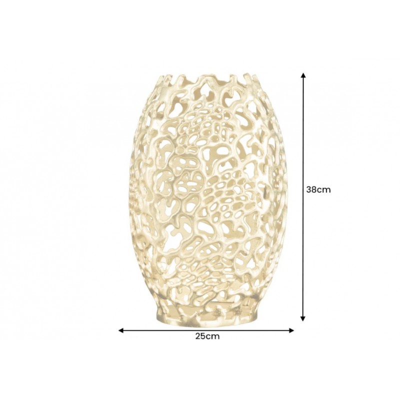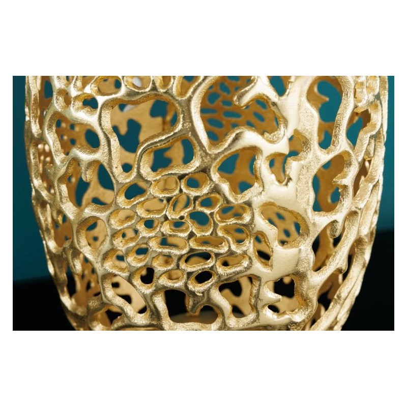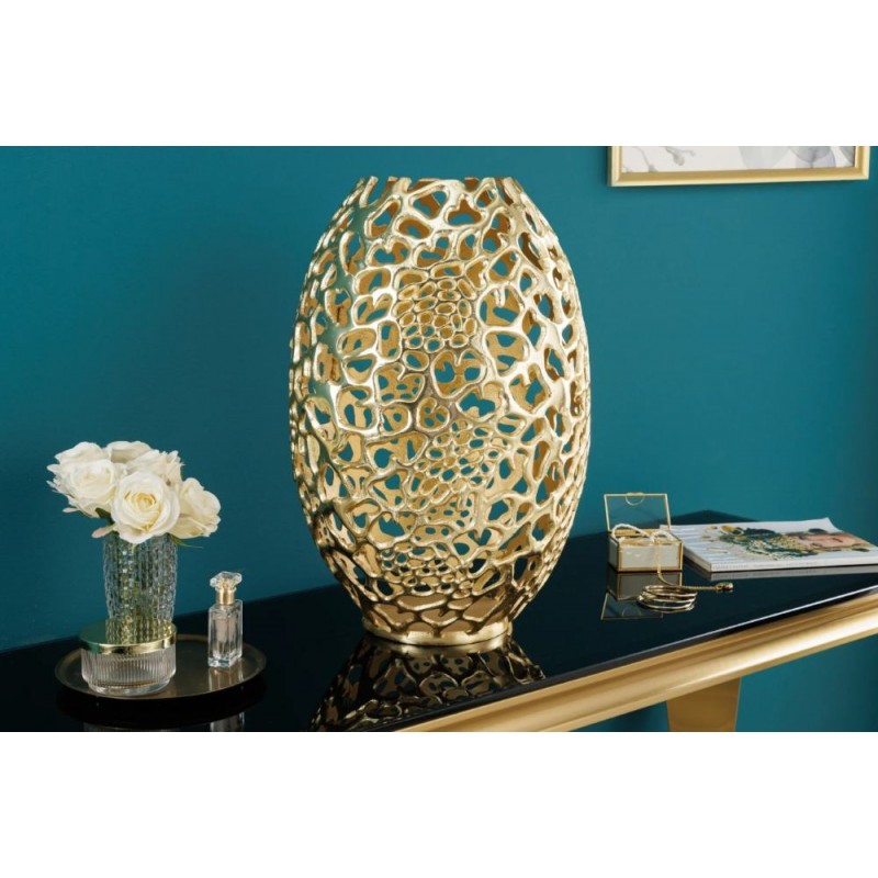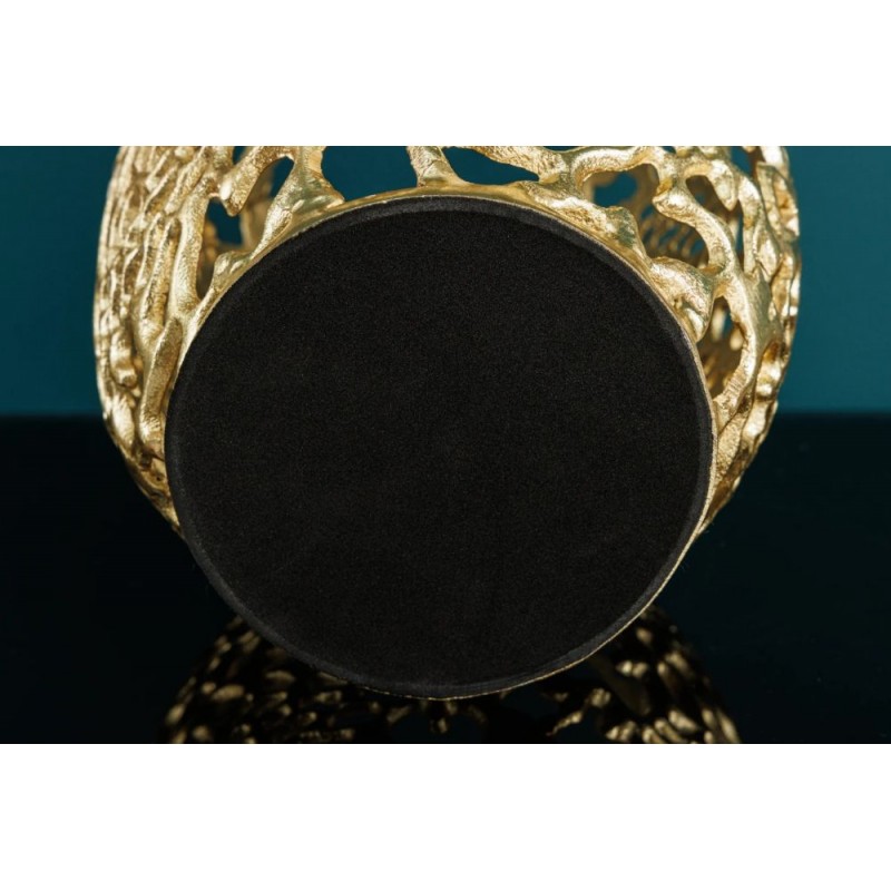 Wazon ABSTRACT LEAF to znakomity dodatek do każdego pomieszczenia, który sprawdzi się idealnie we wnętrzach w stylu nowoczesnym oraz glamour, gdzie dzięki swojej formie doda przestrzeń niezwykłego charakteru. Wyjątkowość wazonu stanowi jego kształt oraz wygląd odzwierciedlający pajęczynę, wzór ten wykonywany jest za pomocą frezowania ręcznego ze stopu metalowo-aluminiowego, dzięki czemu kusi swoją unikalnością oraz niepowtarzalnością. Złote wykończenie dodaje mu luksusowego charakteru, a abstrakcyjna forma przyciąga wzrok i wprowadza do wnętrza nutę nowoczesnej elegancji. Wazon ABSTRACT LEAF sprawdzi się znakomicie w każdym wnętrzu, gdzie stanie się nie tylko piękną ozdobą, ale także funkcjonalnym elementem pozwalającym na prezentowanie kwiatów czy innych dekoracji.