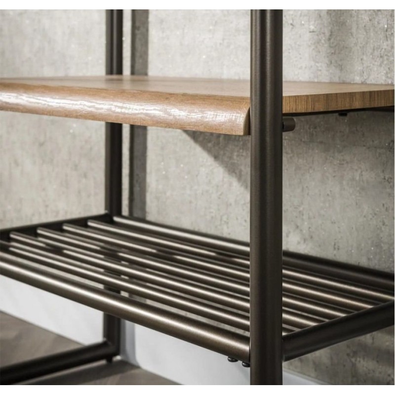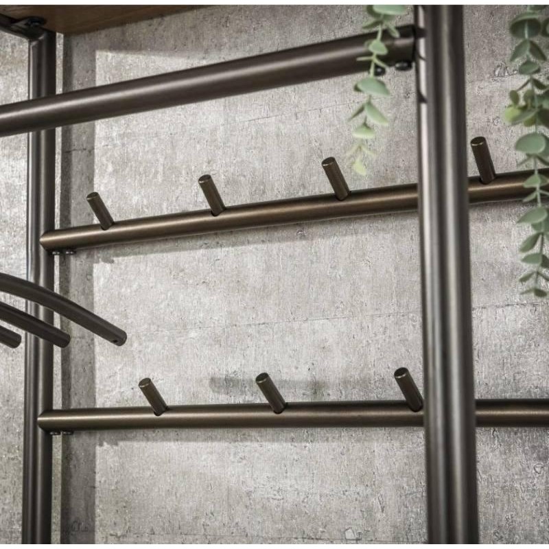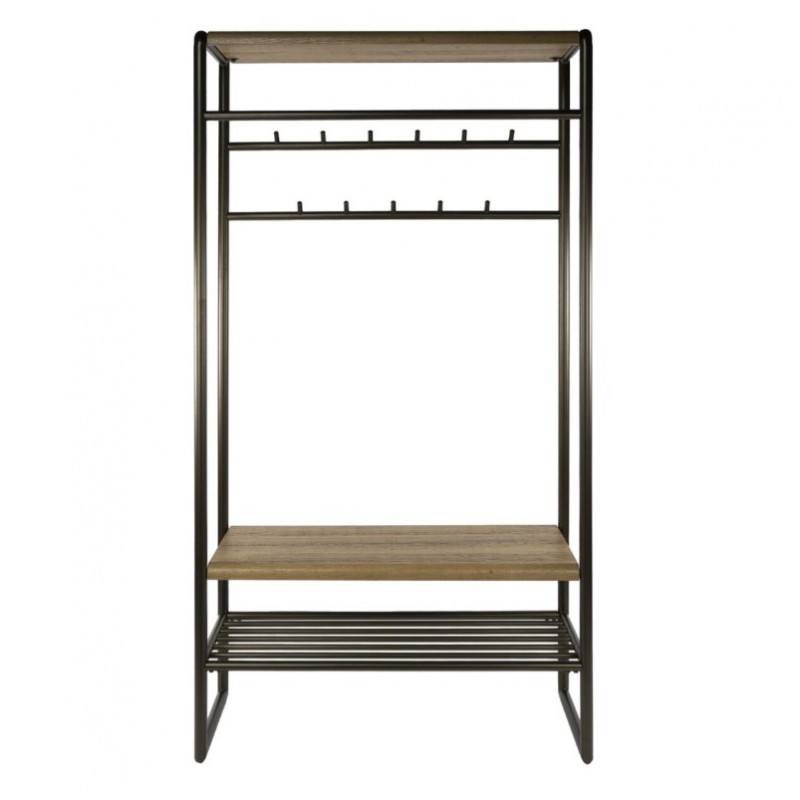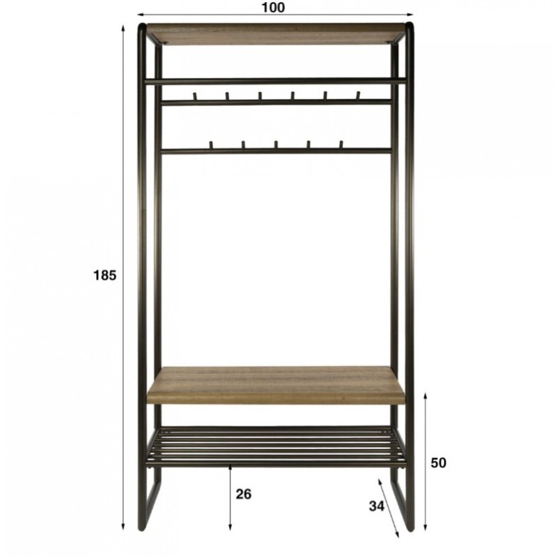 Wieszak stojący na ubrania ELMER to propozycja dla miłośników minimalistycznych wnętrz i industrialnego klimatu, który sprawdzi się idealnie w przedpokoju, salonie oraz poczekalni. Ten elegancki i wielofunkcyjny mebel na ubrania posiada dwa rzędy wieszaków z jedenastoma haczykami oraz długi metalowy drążek, na którym swobodnie można powiesić wieszaki z odzieżą wierzchnią. Dodatkowo został on wyposażony w dwie praktyczne półki wykonane z płyty MDF pokrytej dekorem drewnianym, służące miedzy innymi do przechowywania czapek, szali, kapeluszy czy innych części odzieży oraz dolną metalową półkę przeznaczoną na obuwie. Stelaż w całości wykonany z metalu jest osadzony na stabilnej metalowej konstrukcji w odcieniu brązowym. Mebel ten swoją funkcjonalnością oraz prostą formą sprawia, iż odnajdzie się on doskonale we wnętrzu nowoczesnym jak również industrialnym.