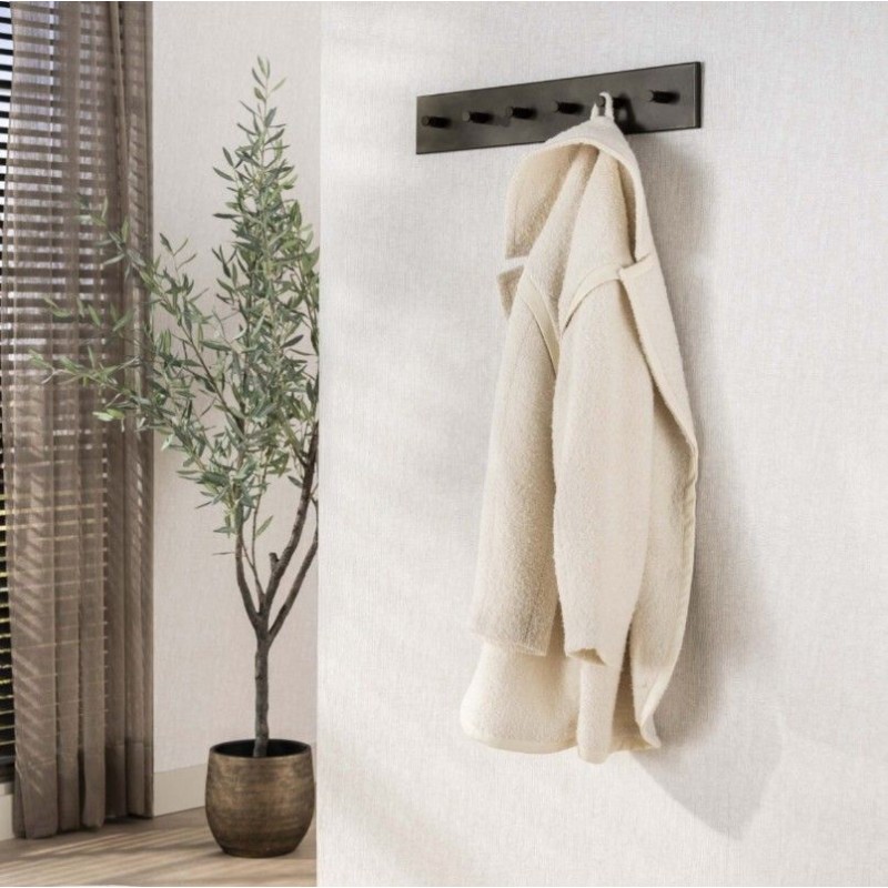 BADDY to nowoczesny wieszak ścienny wykonany w całości z metalu w brązowym odcieniu. Wyposażony w sześć solidnych metalowych haczyków umożliwia wygodne przechowywanie odzieży wierzchniej, zachowując porządek i łatwy dostęp do zawieszonych rzeczy. Jednolita kolorystyka podkreśla jego minimalistyczną formę oraz nowoczesny charakter. Montaż ścienny oparty na dwóch punktach mocowania pozwala na optymalne wykorzystanie przestrzeni, dzięki czemu wieszak doskonale sprawdzi się w przedpokoju, salonie lub garderobie. BADDY to praktyczne rozwiązanie, które łączy estetykę z wygodą, czyniąc go zarówno stylową ozdobą wnętrza, jak i niezwykle użytecznym elementem jego wyposażenia.