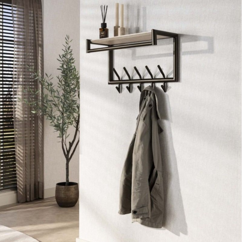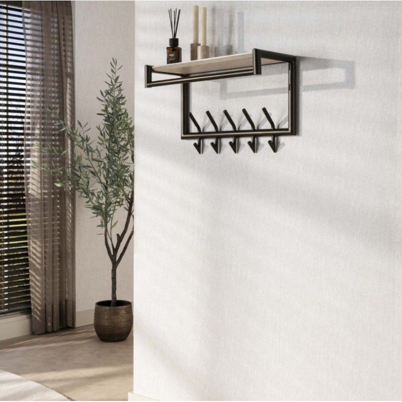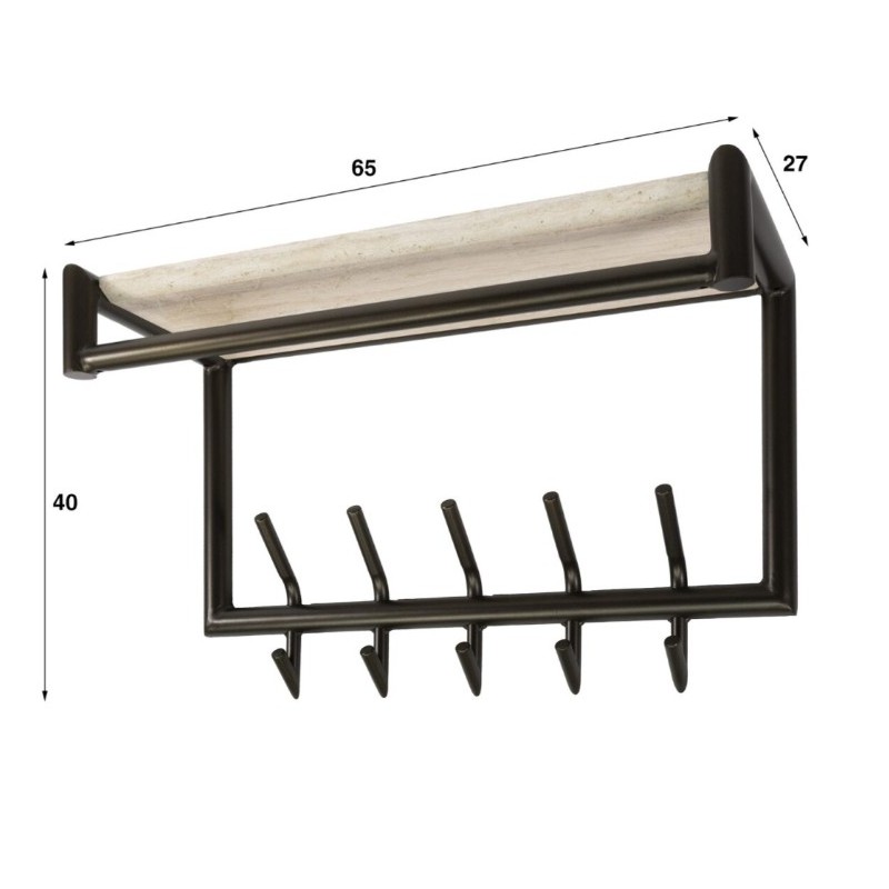 Wieszak ścienny BADDY doskonale uzupełni przestrzeń przedpokoju, salonu czy nawet poczekalni, zapewniając idealne miejsce do przechowywania odzieży wierzchniej. Został wykonany z brązowej metalowej ramy, składa się z 5 haczyków oraz poziomego długiego drążka na którym swobodnie można powiesić wieszaki. Dodatkowo posiada on praktyczną górną półkę wykonaną z płyty MDF oklejonej melaminą imitującą trawertyn, służącą miedzy innymi do przechowywania czapek, szali, kapeluszy czy innych części odzieży. Bez wątpienia jego ścienne mocowanie pozwala zaoszczędzić miejsce na podłodze przez co czyni go niezwykle praktycznym. Mebel ten swoją funkcjonalnością oraz prostą formą sprawia, iż odnajdzie się on doskonale w każdym nowoczesnym wnętrzu.