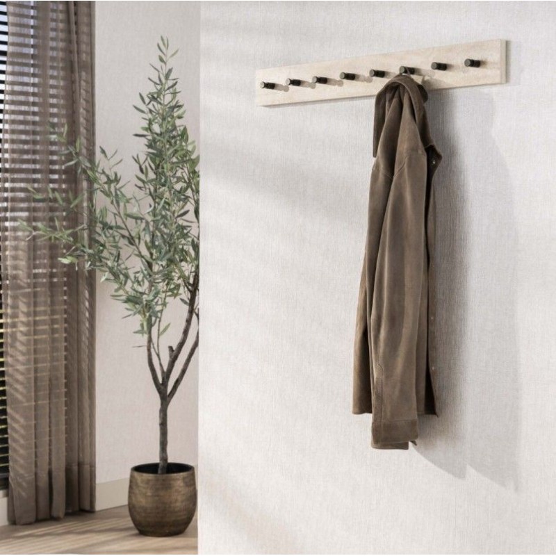 TIAGO to nowoczesny wieszak wykonany z ceramiki w odcieniu beżowym, której struktura podkreśla unikatowość mebla. Dekor inspirowany naturalnym kamieniem o wyglądzie trawertynu, wzbogacony subtelną, charakterystyczną kolorystyką oraz jaśniejszymi odcieniami beżu, nadaje całości wyrazistego wyglądu. Mebel ten został wyposażony w osiem metalowych haczyków w odcieniu brązu na których można swobodnie zawiesić odzież wierzchnią. Kontrastujące, brązowe elementy doskonale komponują się z jasną, ceramiczną powierzchnią, podkreślając tym samym jego nowoczesny charakter. Montaż ścienny z wykorzystaniem dwóch punktów mocowania pozwala optymalnie wykorzystać przestrzeń, dzięki czemu wieszak idealnie sprawdzi się zarówno w salonie, jak i przedpokoju czy garderobie. To praktyczne rozwiązanie, które łączy estetykę z wygodą, czyniąc go zarówno stylową ozdobą wnętrza, jak i niezwykle użytecznym elementem jego wyposażenia.