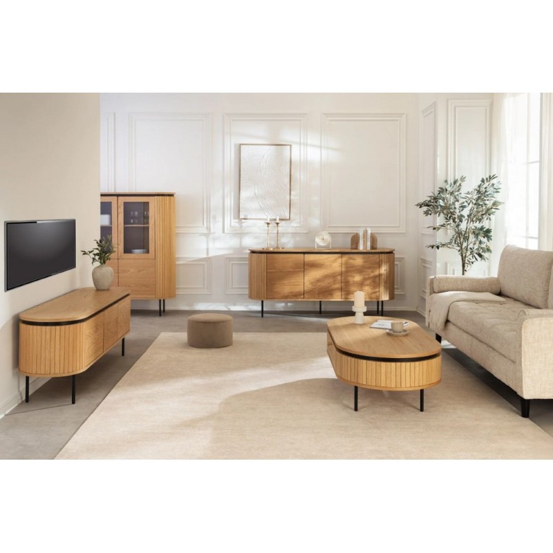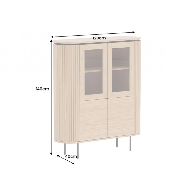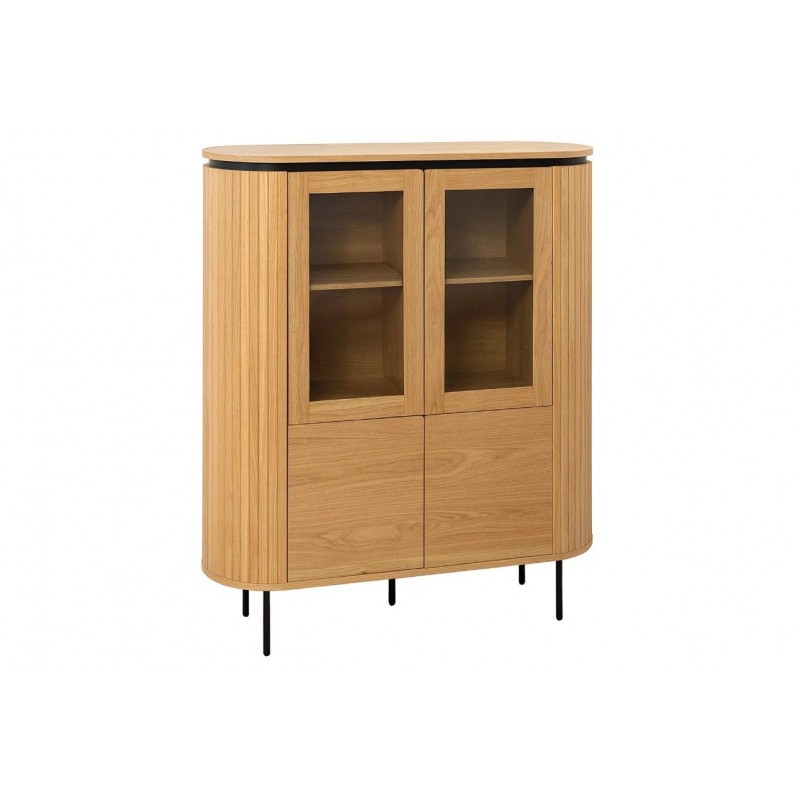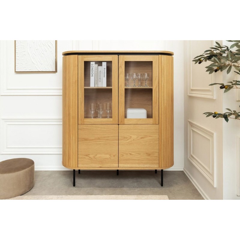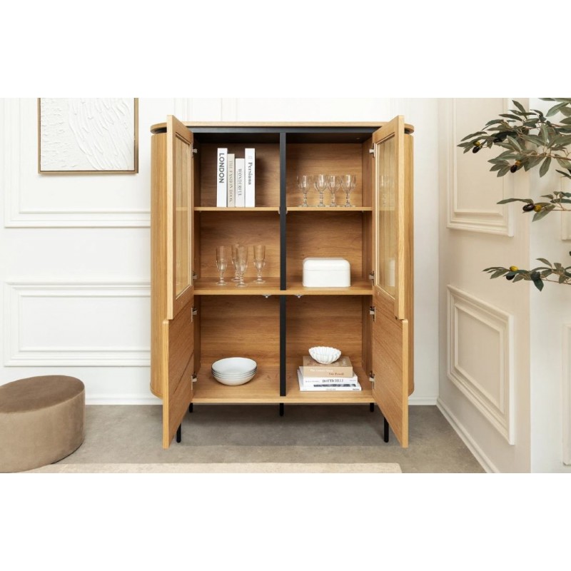 Ta owalna elegancka witryna idealnie wpisze się nie tylko w klasyczne, ale także minimalistyczne nowoczesne wnętrze. Mebel ten wykonany został z płyty MDF oklejonej imitacją dębu, który został osadzony na stabilnej czarnej metalowej podstawie. Dzięki swojej smukłej linii całość witryny wspaniale komponuje się z podstawą utrzymaną w ciemnej tonacji. Wyposażona jest w sześć pojemnych przeszklonych oraz zamykanych szafek, dzięki czemu całość mebla bez problemu pomieści najpotrzebniejsze przedmioty codziennego użytku, oferując tym samym dużą powierzchnię do przechowywania. Bez wątpienia jej zaletą jest funkcjonalność, wytrzymałość oraz łatwość czyszczenia, wyróżnia się swoją wyrazistością, kolorem i strukturą powodując, że każdy egzemplarz jest unikatowy. Fronty lamelowe w imitacji dębu ze strukturą drewna nadają jej cennego i naturalnego wyrazu. Ponadto wykonana jest niewątpliwie z dużą precyzją, dzięki zachowaniu i odwzorcowaniu naturalnej oryginalności zarówno słojów jak i sęków. Połączenie wyglądu metalu oraz dębu nadaje mu industrialny charakter, który również wspaniale wzbogaci każdy nowoczesny salon.