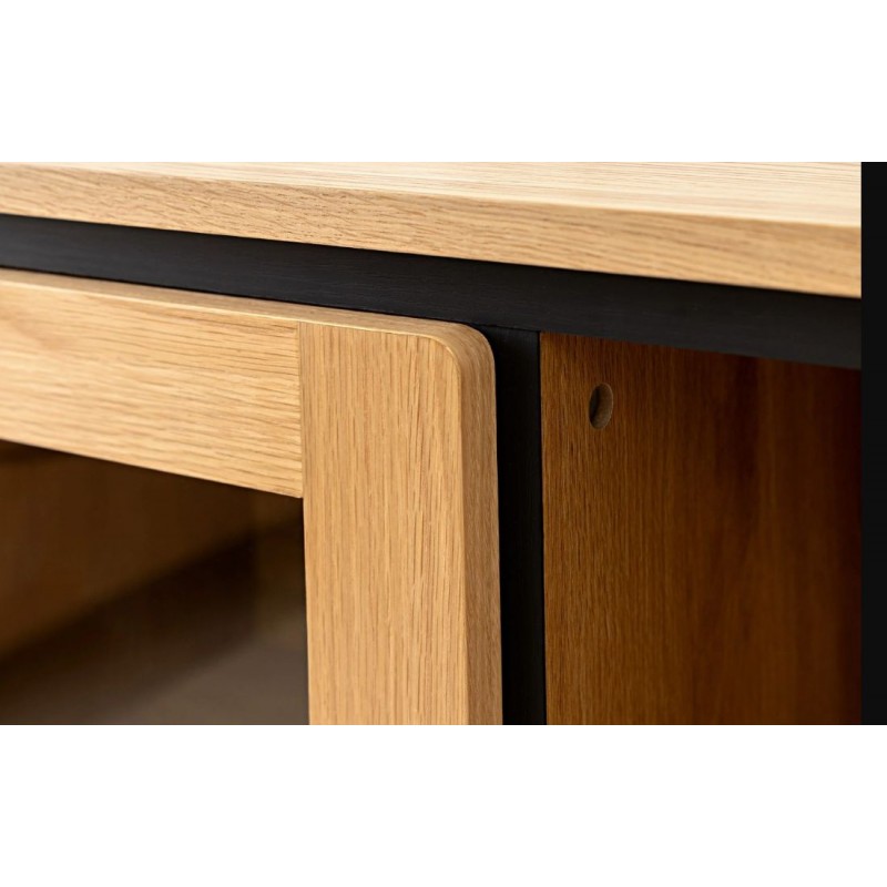 KOMODA TOKYO 205X45CM DĄB CZARNY Stylowa komoda wyposażona w szuflady i półki, która upiększy każdy nowocześnie i elegancko urządzony salon, jadalnię lub sypialnię. Wykonana z lakierowanego na czarno forniru dębowego, płyty MDF i eleganckich nóg z lakierowanej stali, jej minimalistyczny styl gwarantuje wysoką stabilność i styl. Drzwi frontowe i szuflady...
