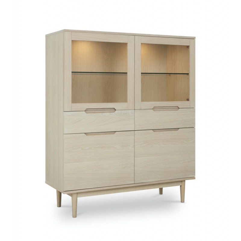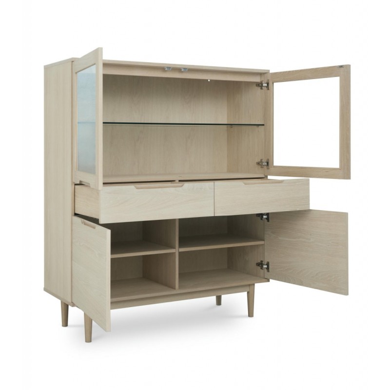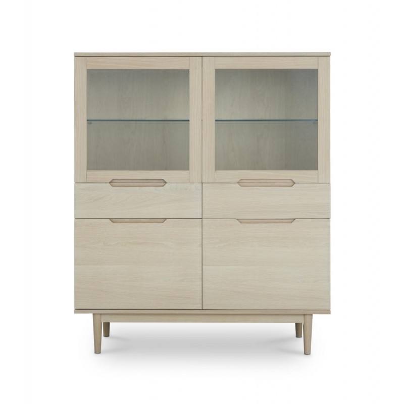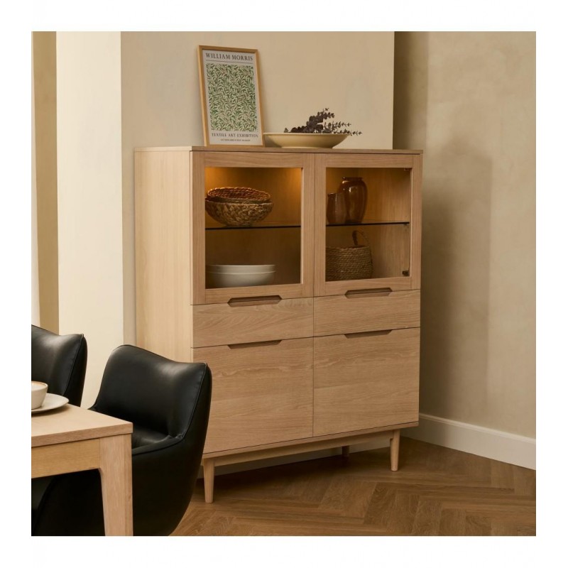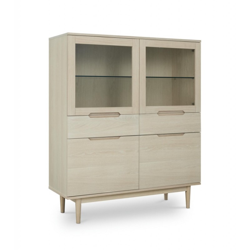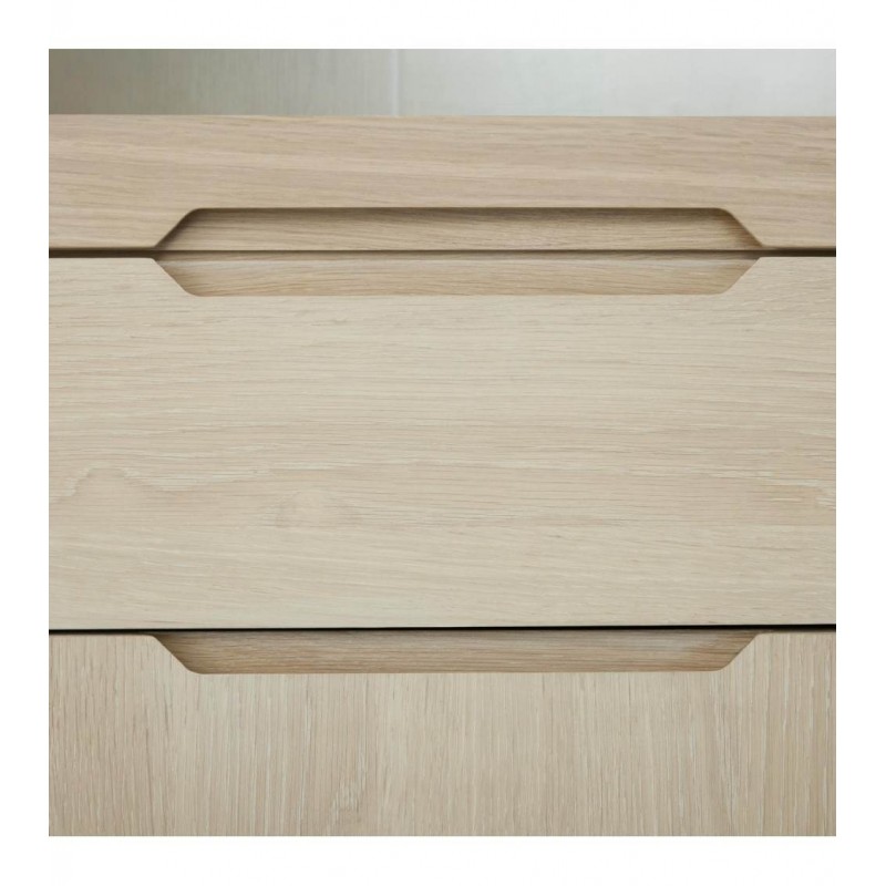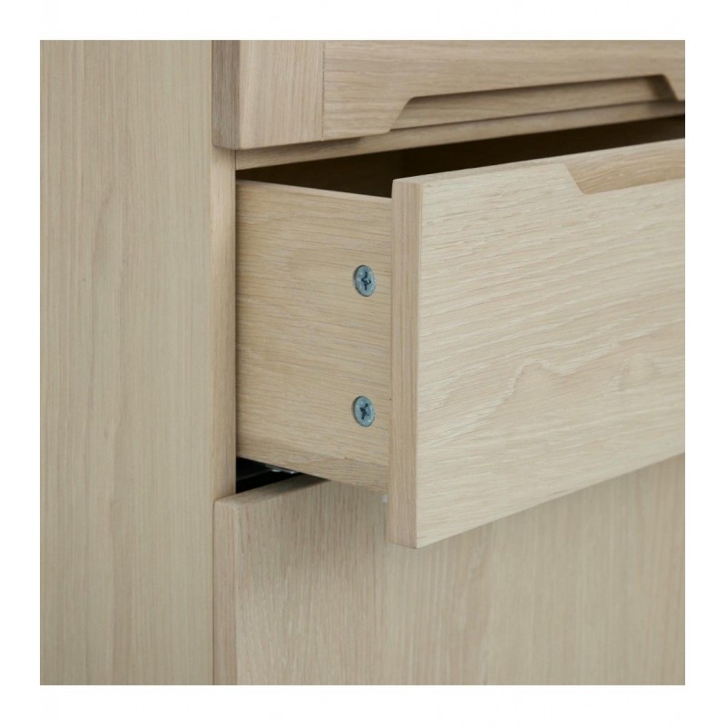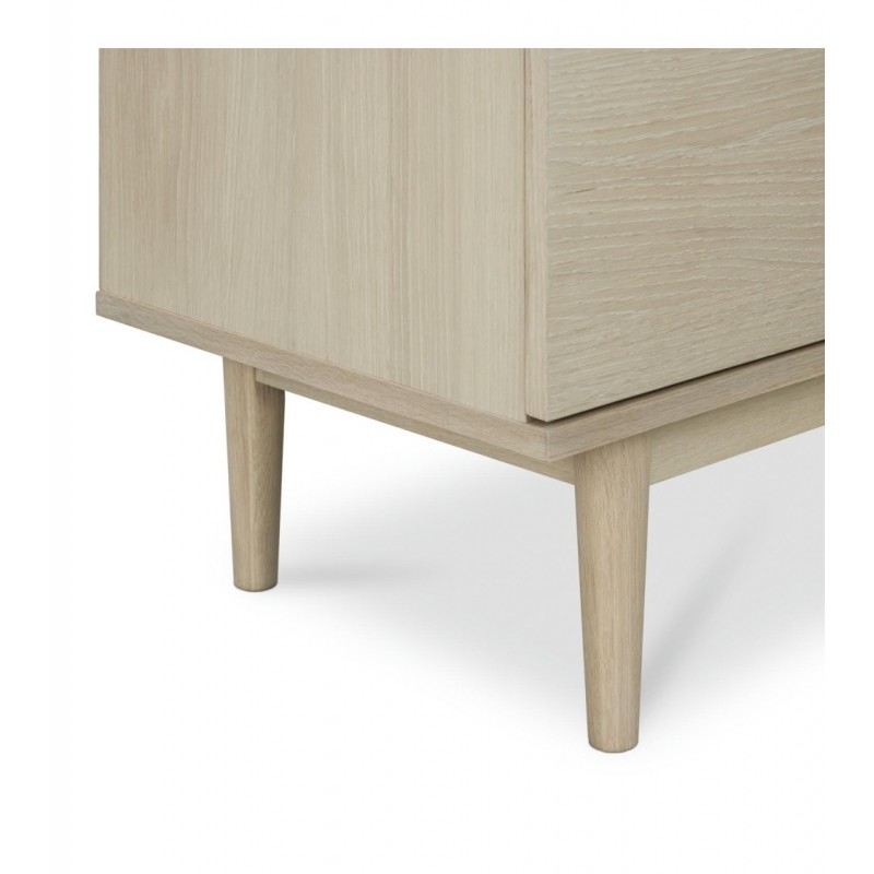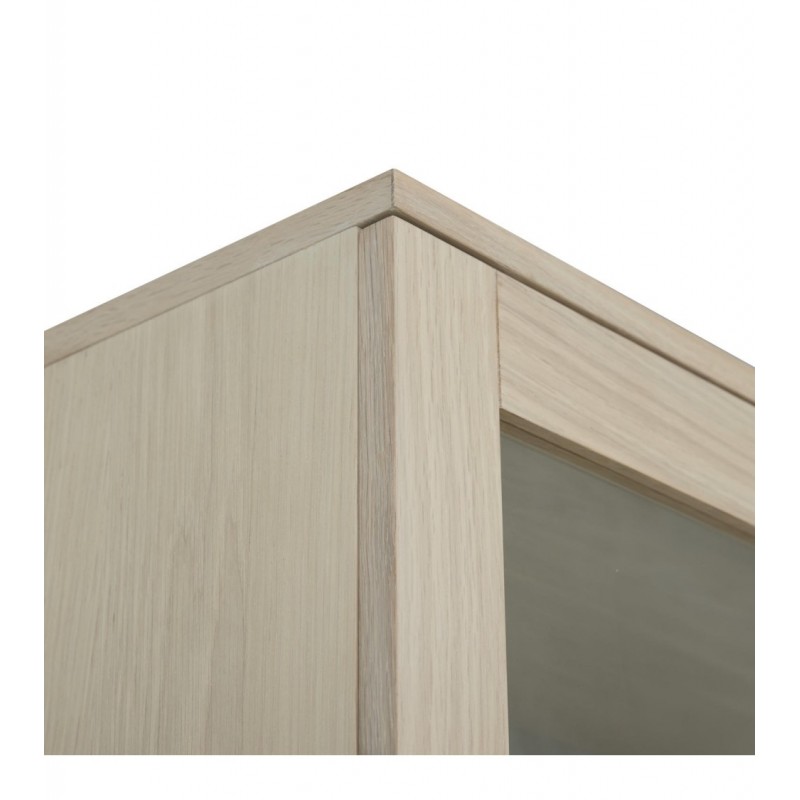 Witryna KERTEMINDE to idealne rozwiązanie do każdego wnętrza w stylu nowoczesnym, dodająca przestrzeni niezwykle naturalnego wykończenia. Została wykonana z wysokiej jakości materiałów, takich jak lite drewno dębowe, fornir dębowy oraz płyta MDF, zapewniająca trwałość i elegancki wygląd. Powierzchnie wykończono olejem na bazie bielonego forniru dębowego, który nadaje ciepła i wyrafinowania każdemu wnętrzu harmonijnie komponując się z różnymi stylami aranżacji. Witryna ta wyposażona jest w system cichego zamykania, co sprawia, że jej użytkowanie jest wyjątkowo funkcjonalne i komfortowe. Frezowane uchwyty podkreślają nowoczesny i elegancki design mebla. Wyposażona jest w dwie szuflady oraz dwie podwójne pojemne przeszklone i zamykane szafki, dzięki czemu całość mebla bez problemu pomieści najpotrzebniejsze przedmioty codziennego użytku, oferując tym samym dużą powierzchnię do przechowywania. Zaletą tego mebla jest funkcjonalność, wytrzymałość oraz łatwość czyszczenia, ponadto wyróżnia się swoją wyrazistością, kolorem i strukturą powodując, że każdy egzemplarz jest unikatowy. Zaprojektowana jest niewątpliwie z dużą precyzją, dzięki zachowaniu naturalnej oryginalności drzewa zarówno słojów jak i sęków, które prezentują się fenomenalnie, nadając tym samym meblowi oryginalnego charakteru. Witryna KERTEMINDE sprawdzi się znakomicie w każdym nowoczesnym salonie, gdzie stanie się nie tylko funkcjonalnym meblem, ale także przepiękną dekoracją, dzięki której pomieszczenie nabierze ciepła i naturalnego efektu.
