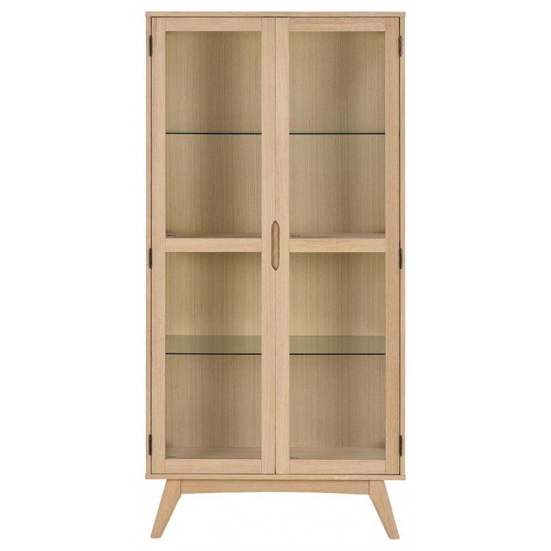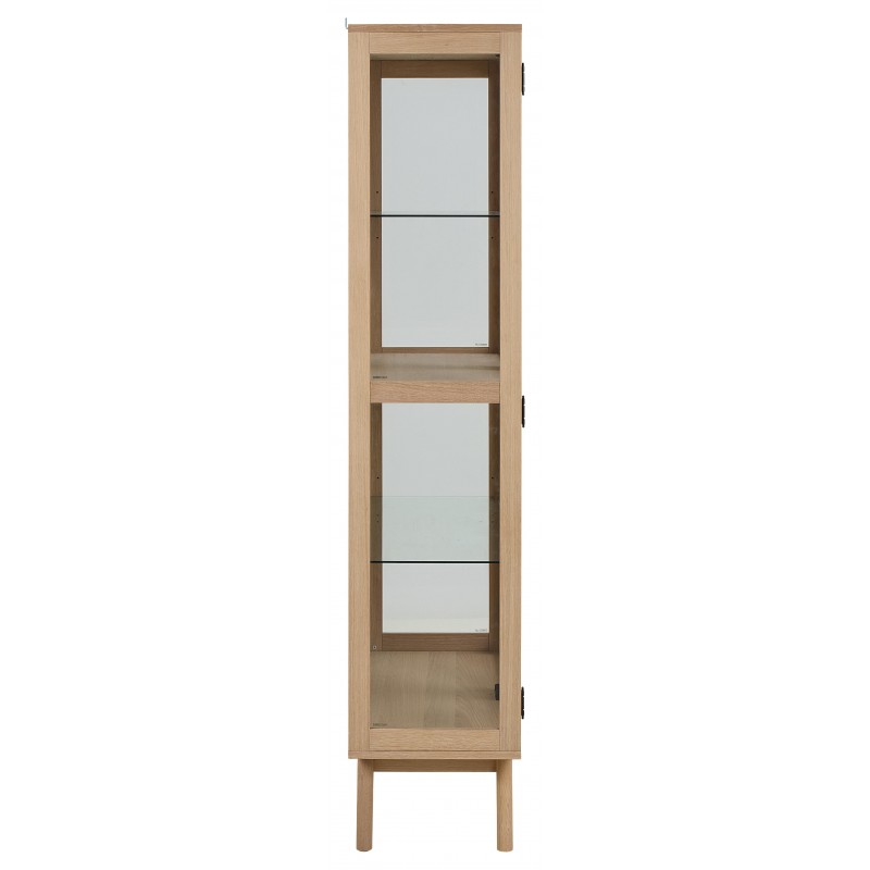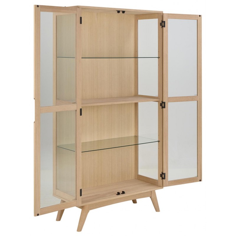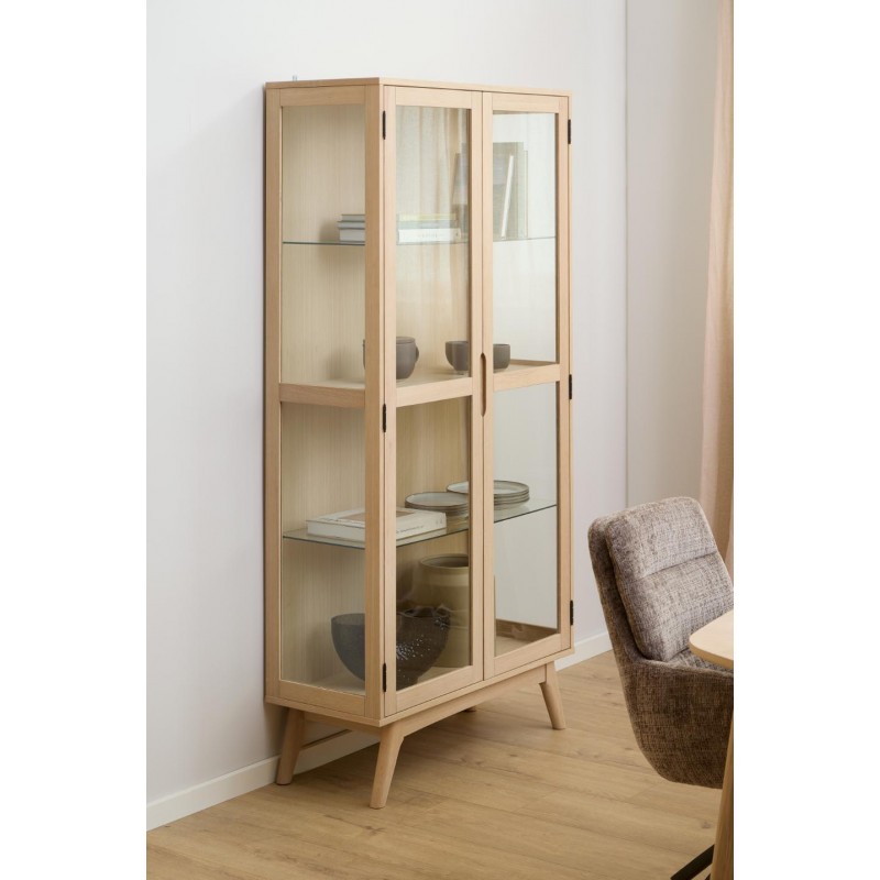 Elegancka witryna do jadalni lub salonu w stylu skandynawskim znajdzie zastosowanie w wielu wnętrzach. Witryna wykonana z forniru dębowego w połączeniu ze szklanymi drzwiami i skośnymi nóżkami ładnie będzie się prezentować w każdym wnętrzu. Witryna zapewnia mnóstwo miejsca do przechowywania naczyń i dekoracji dzięki trzem półkom za szklanymi drzwiami.