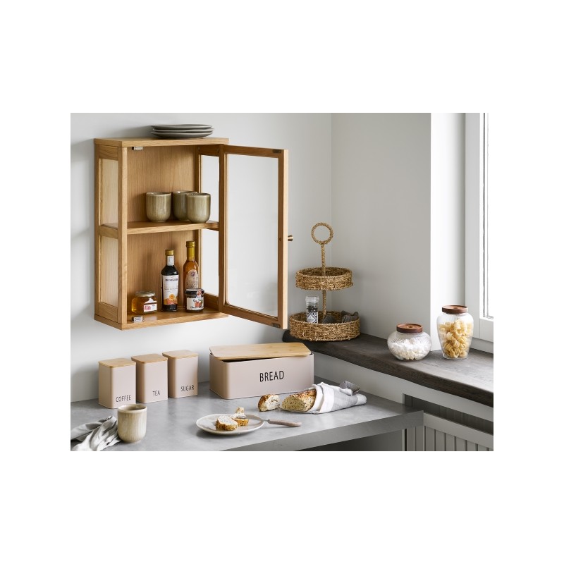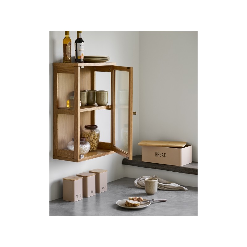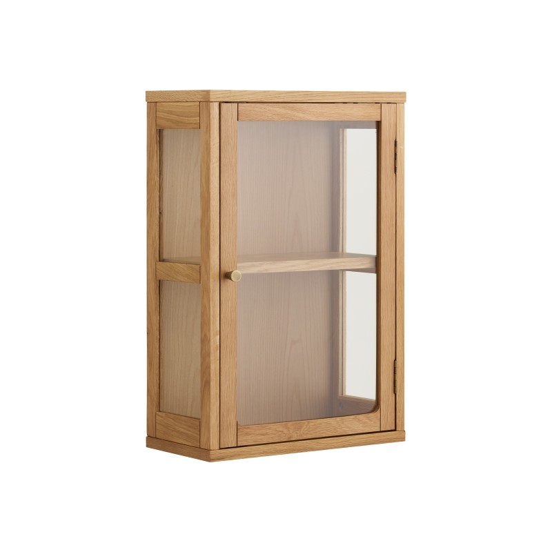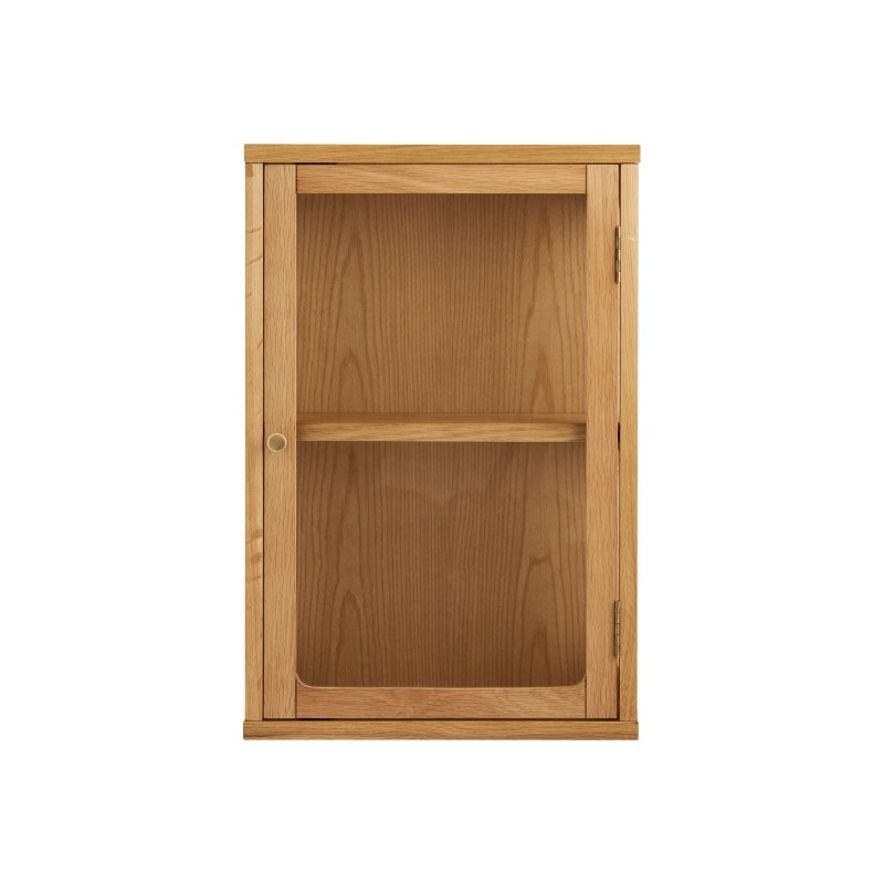 Kompaktowe wymiary sprawiają, że witryna doskonale sprawdzi się jako uzupełnienie aranżacji w salonie, jadalni, kuchni czy domowym biurze, nie zajmując cennej powierzchni podłogi. Montaż na ścianie podkreśla nowoczesny charakter mebla i umożliwia elastyczne dopasowanie jego wysokości do indywidualnych potrzeb. Połączenie naturalnych materiałów, prostej formy i szklanego detalu czyni tę wiszącą witrynę stylowym, a jednocześnie praktycznym elementem wyposażenia, który dodaje wnętrzu lekkości i funkcjonalności.