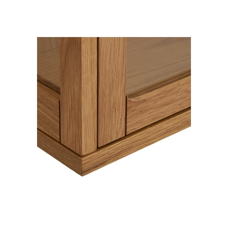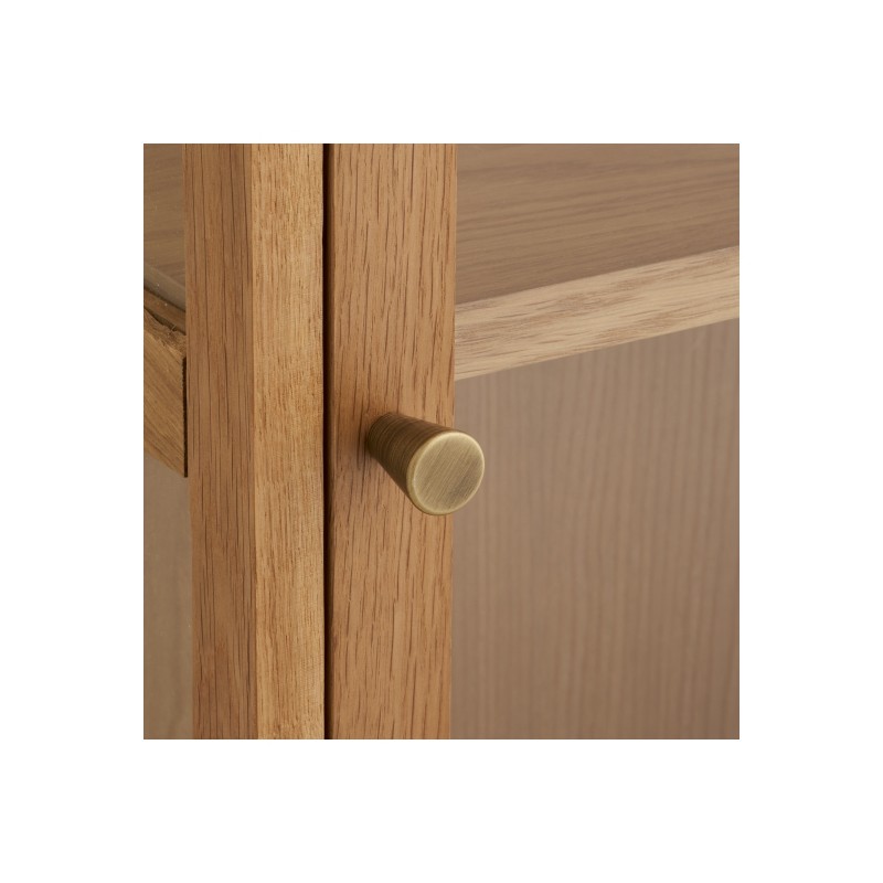 Ta wisząca witryna to subtelne i funkcjonalne rozwiązanie, idealne do nowoczesnych oraz skandynawskich wnętrz, w których liczy się lekkość formy i przemyślana organizacja przestrzeni. Wykonana z forniru dębowego, zachwyca ciepłym odcieniem drewna i naturalnym rysunkiem słojów, wprowadzając do wnętrza harmonię i ponadczasową elegancję. Przeszklony front z hartowanego szkła dodaje bryle wizualnej lekkości oraz pozwala na estetyczną ekspozycję dekoracji, szkła lub drobnych akcesoriów.