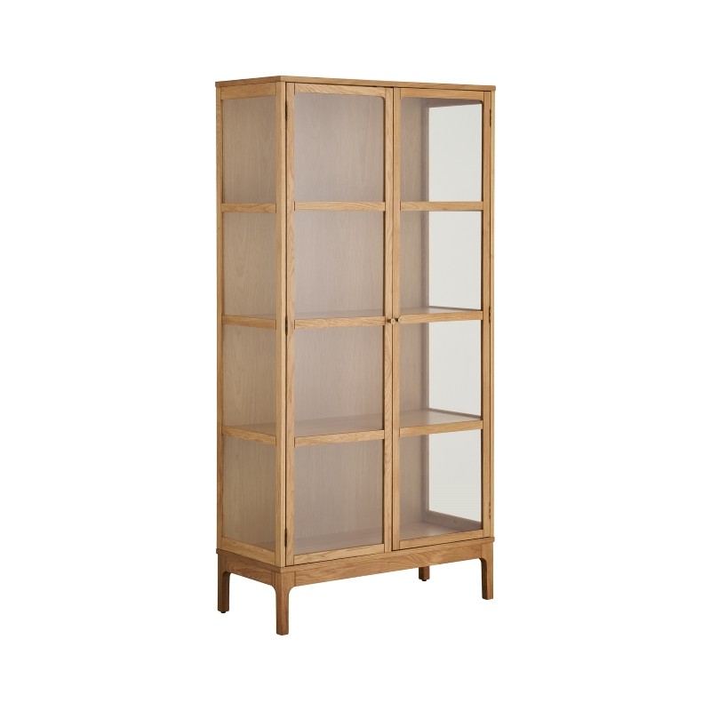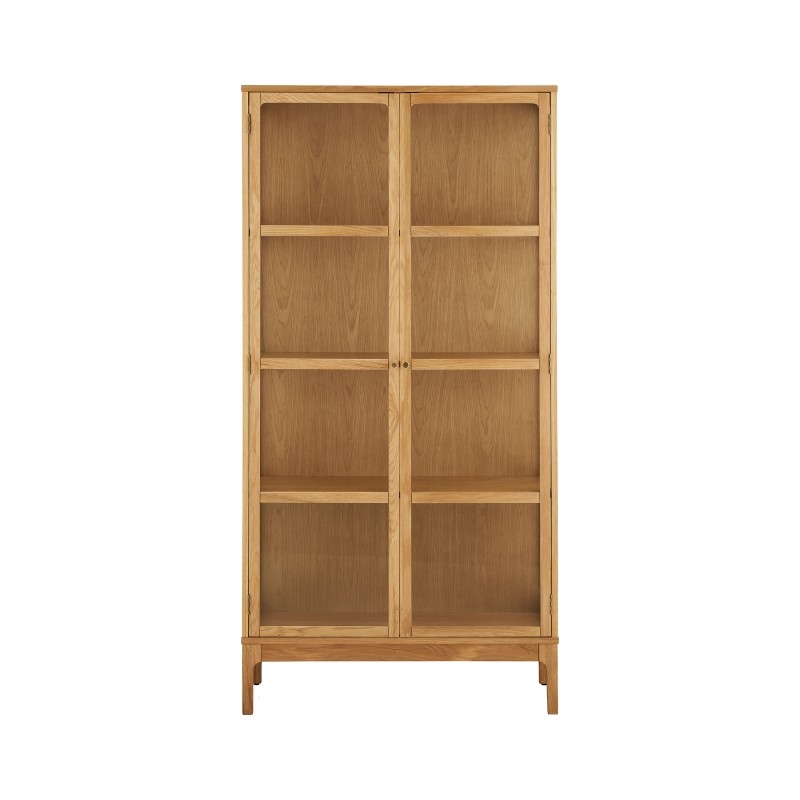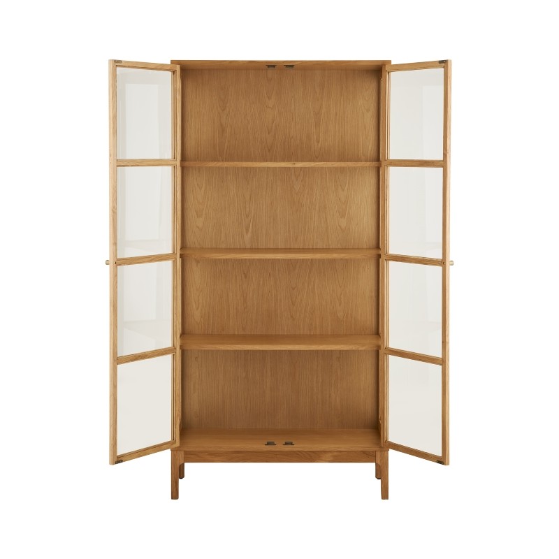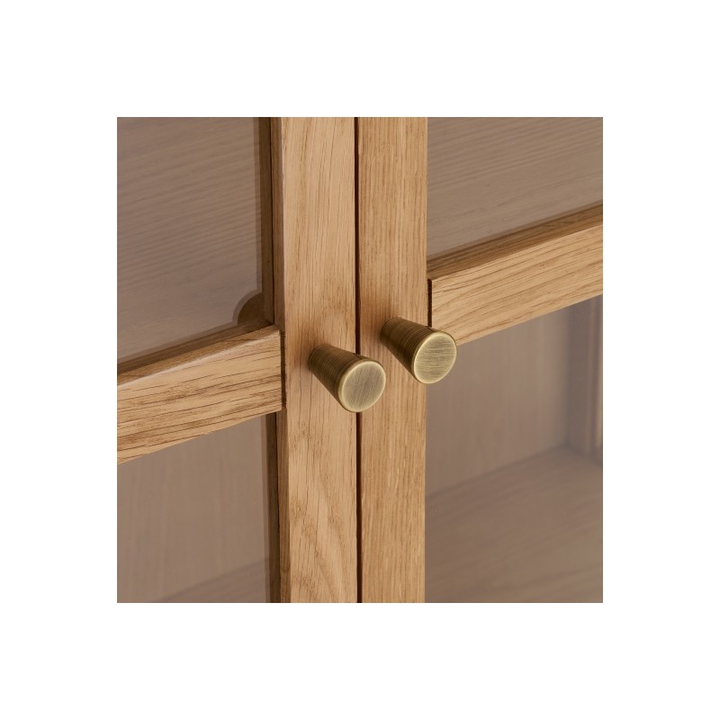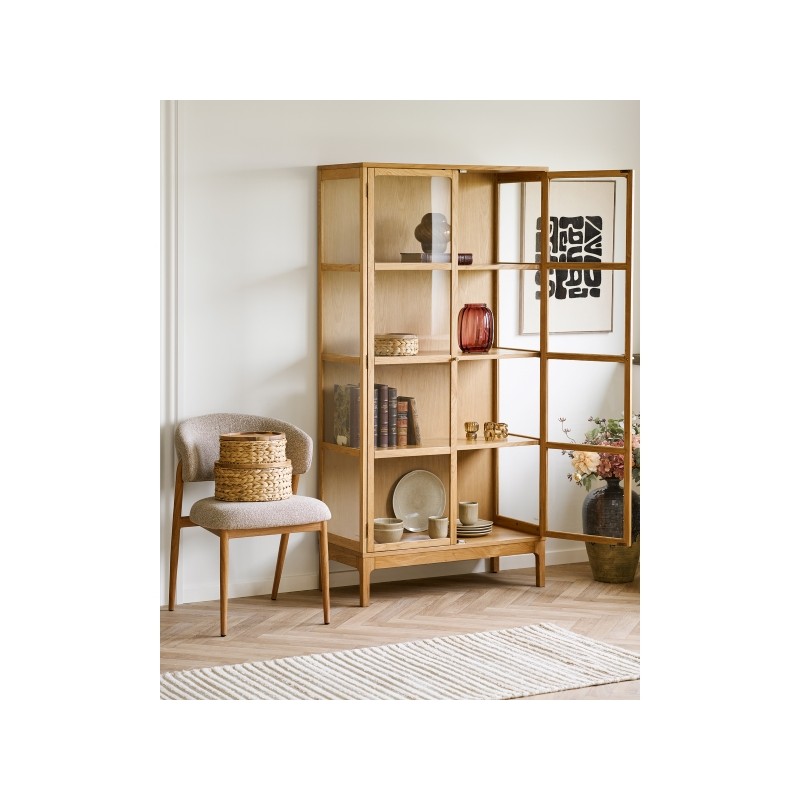 Wnętrze witryny zostało wyposażone w praktyczne półki, które ułatwiają organizację i przechowywanie, zachowując jednocześnie estetyczny porządek. Smukła forma oraz proporcje mebla sprawiają, że świetnie sprawdzi się zarówno w jadalni, salonie, jak i domowym gabinecie, nie przytłaczając wnętrza. Naturalne materiały w połączeniu z prostą, ponadczasową konstrukcją czynią tę witrynę uniwersalnym elementem wyposażenia, który będzie cieszył oko i służył przez długie lata.
