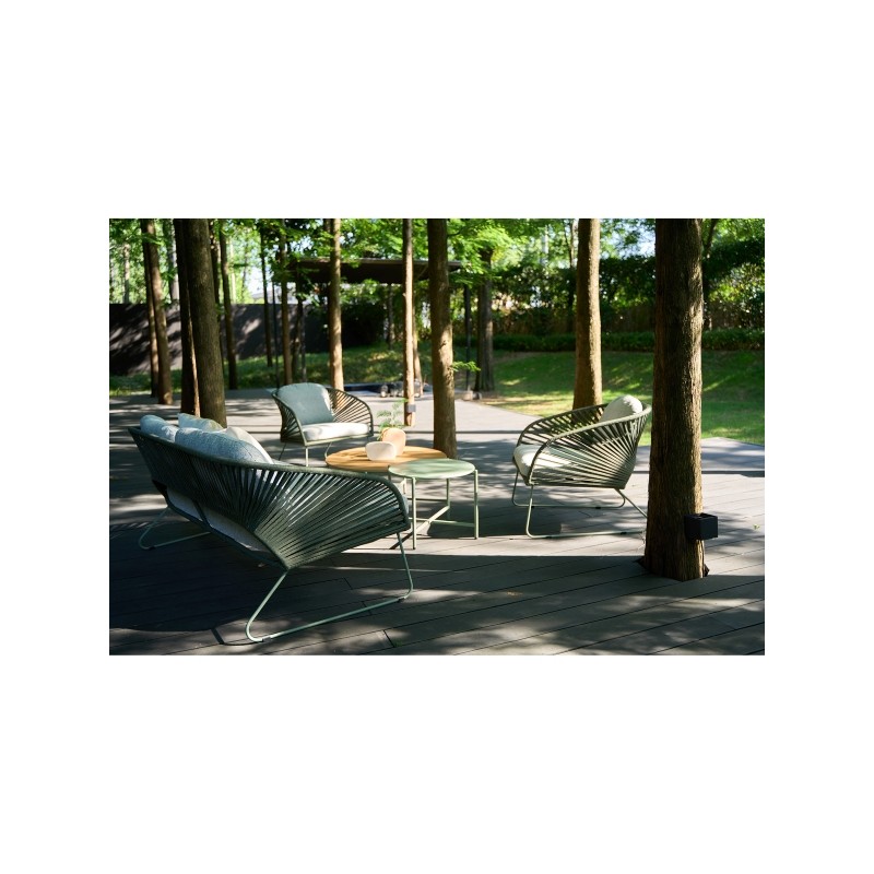 Chania - Modny zestaw sof, który stawia na wygodę i przyciągający wzrok design. Zestaw sof składa się z dwuosobowej sofy, dwóch foteli z ramą, w tym grubych, trwałych, ciemnoszarych poduszek. Sofa zawiera również niski stolik kawowy wykonany w całości z pięknej akacji. Zestaw sof wykonany jest z ramy z aluminium i nóg z akacji, a tył i boki są oplecione...