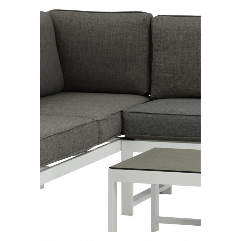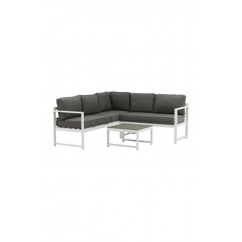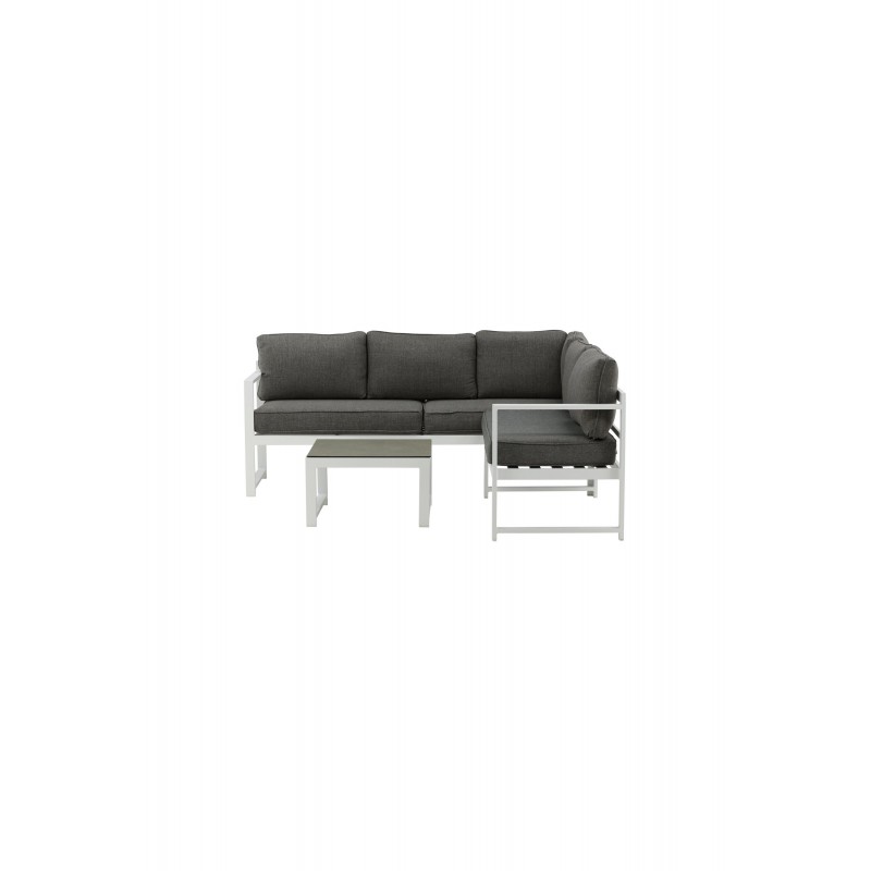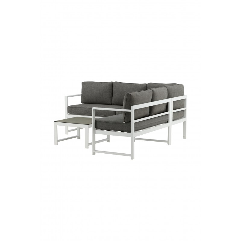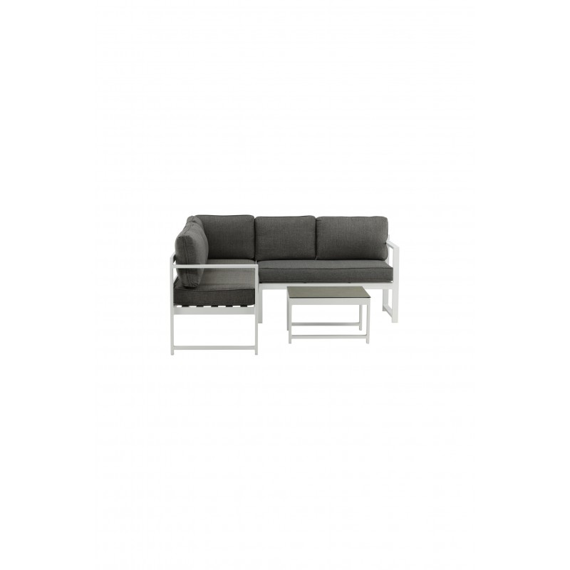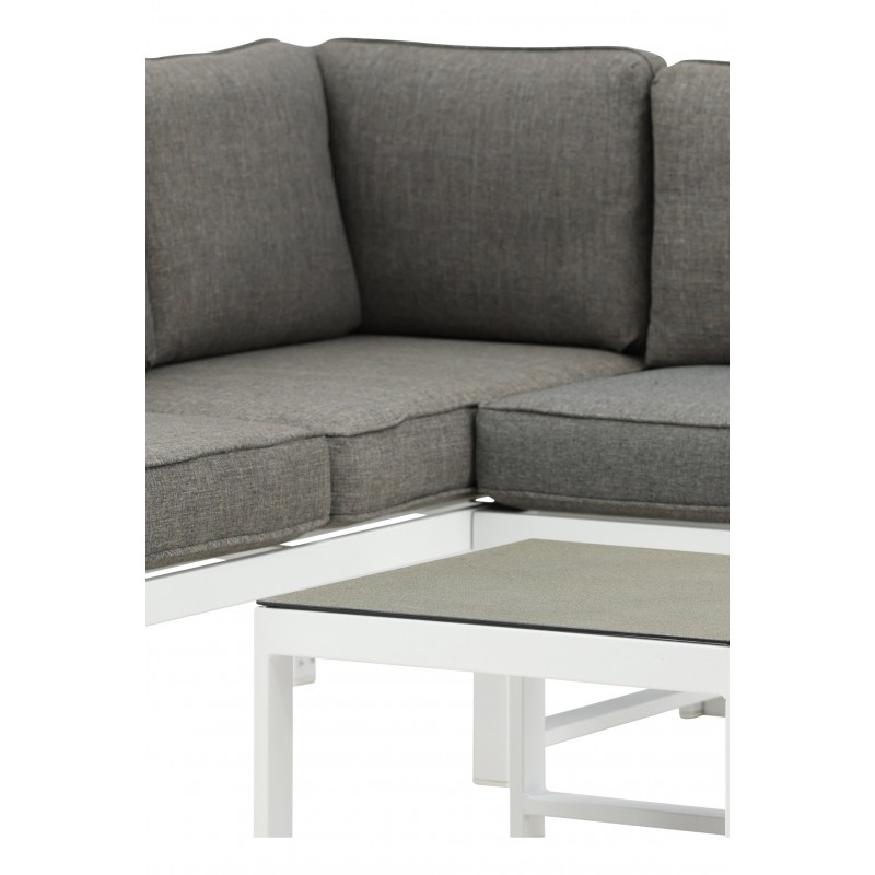 Nowoczesna stylowa sofa z narożnikiem na patio lub balkon. Wykonana z białej malowanej proszkowo metalowej ramy ze zintegrowanymi podłokietnikami. W zestawie miękkie szare poduszki i niski stolik kawowy ze szkła z przemową świerkową. Wymagany jest montaż.