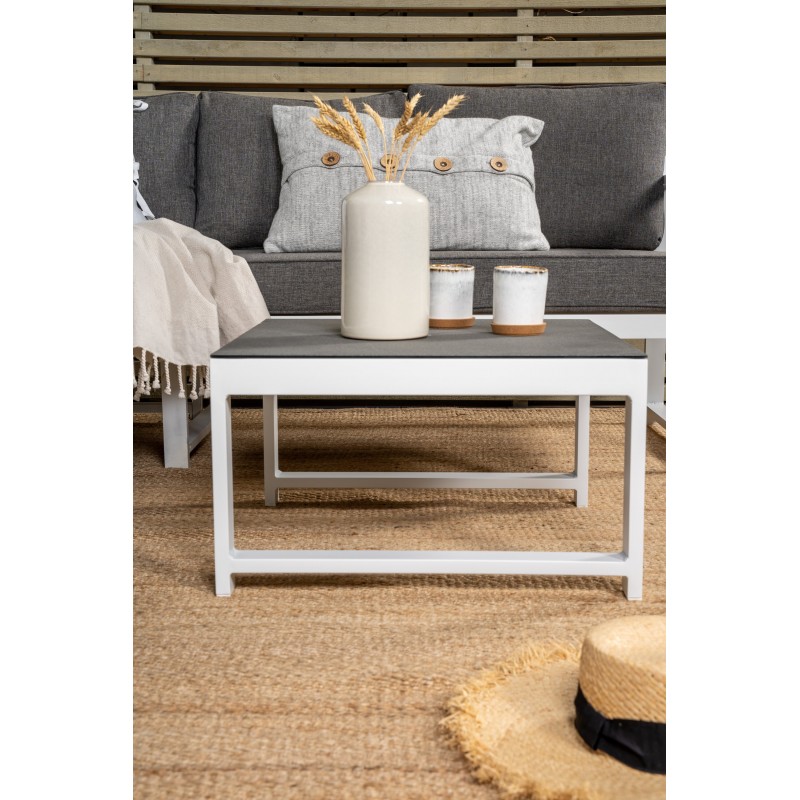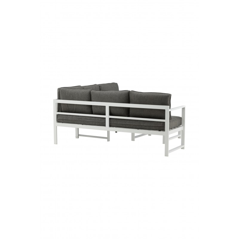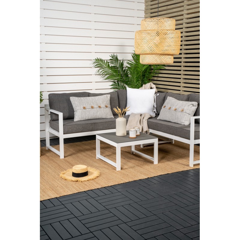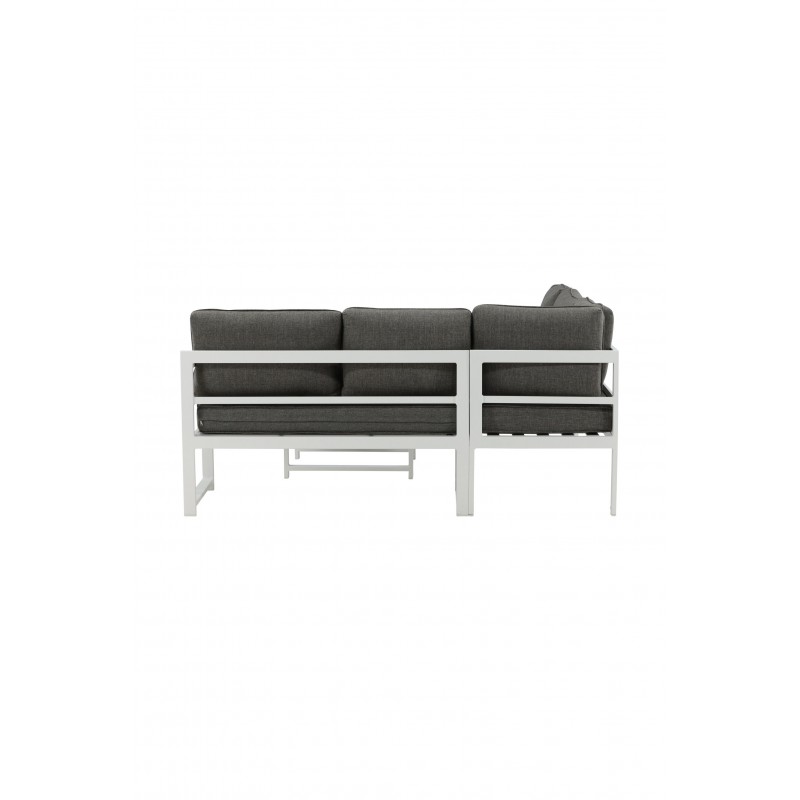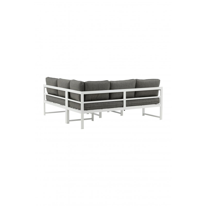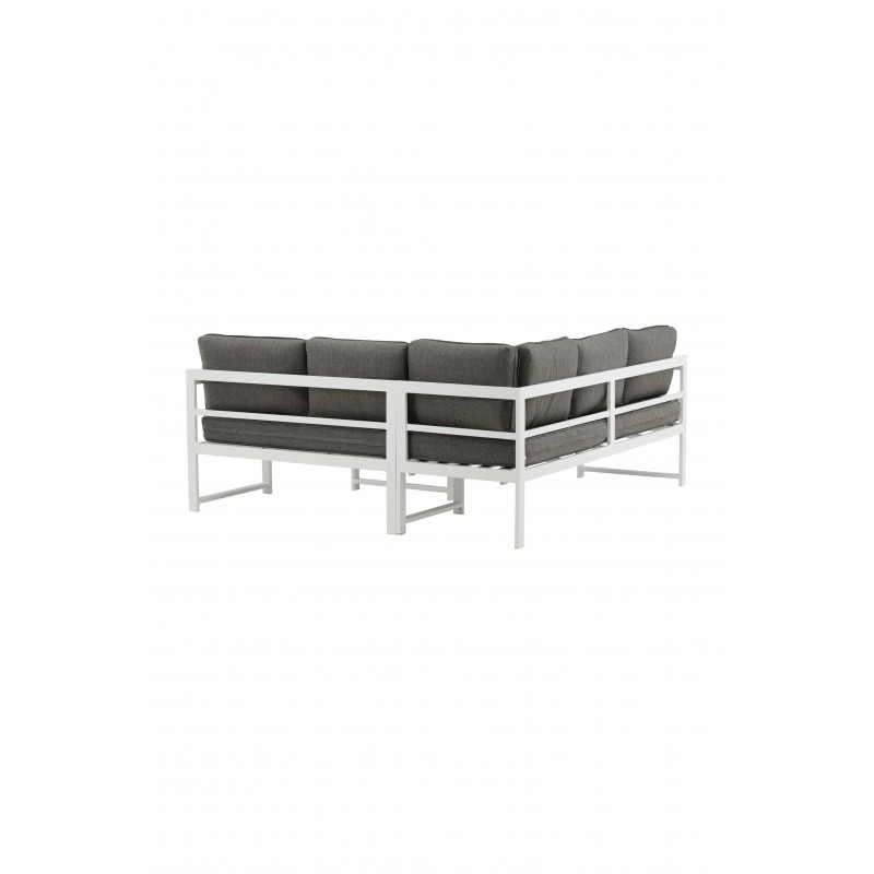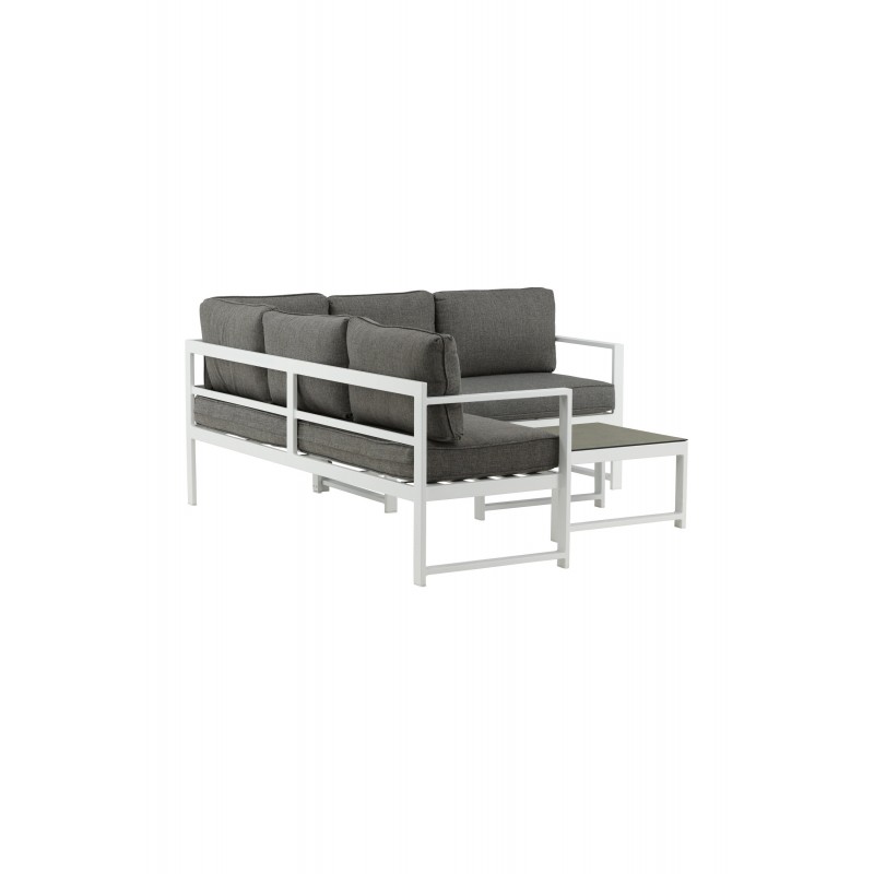 Nowoczesna stylowa sofa z narożnikiem na patio lub balkon. Wykonana z białej malowanej proszkowo metalowej ramy ze zintegrowanymi podłokietnikami. W zestawie miękkie szare poduszki i niski stolik kawowy ze szkła z przemową świerkową. Wymagany jest montaż.
