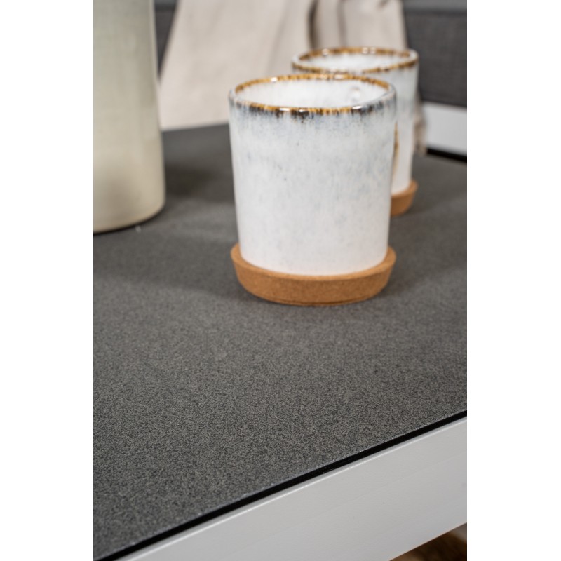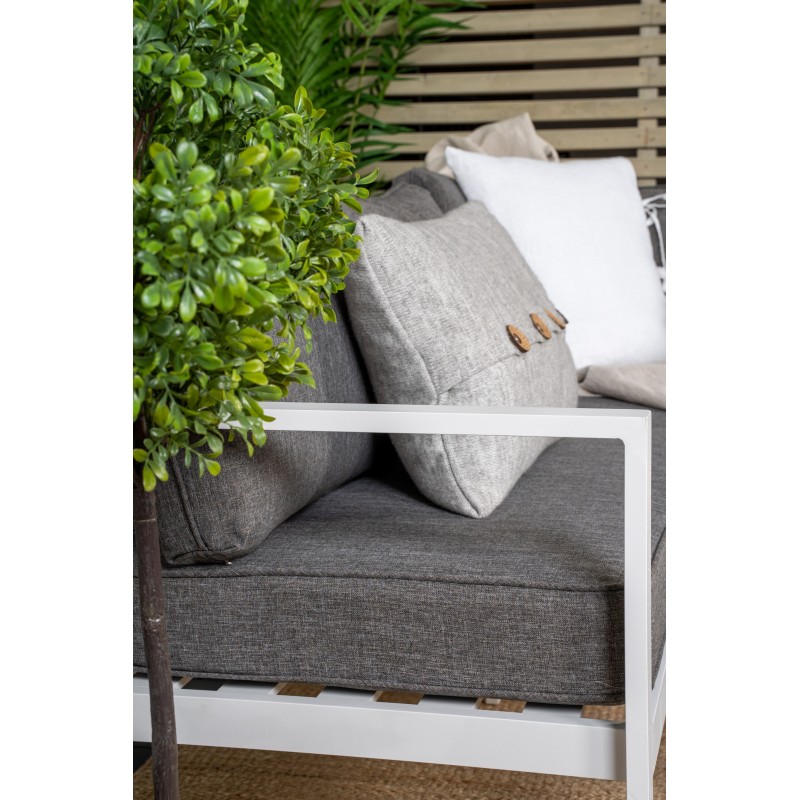 Virya Zestaw ogrodowy to ładny i stylowy zestaw w kolorze białego aluminium z towarzyszącym stołem ze szklanym blatem. W zestawie znajdują się wytrzymałe poduszki w kolorze szarym, a zestaw pomieści łącznie 4 gości. Wymiary stołu: 120x55x45,5 cm. Wymiary sofy: 77x72 cm. Wymiary siedziska: 60/133x65x34 cm. Wymagany jest montaż. Venture Design – kunszt...