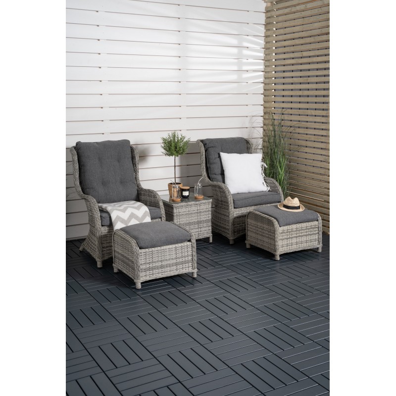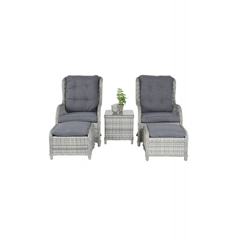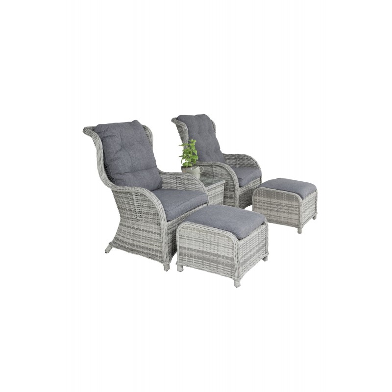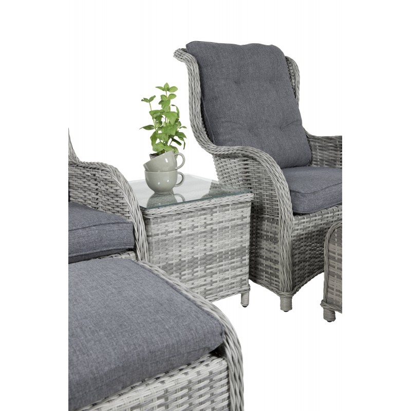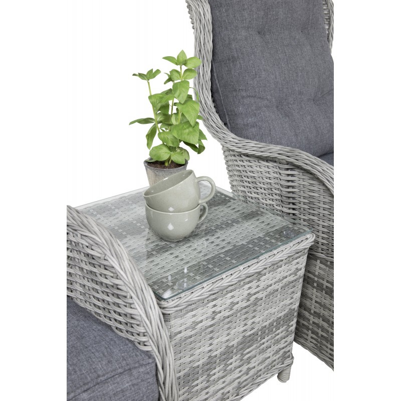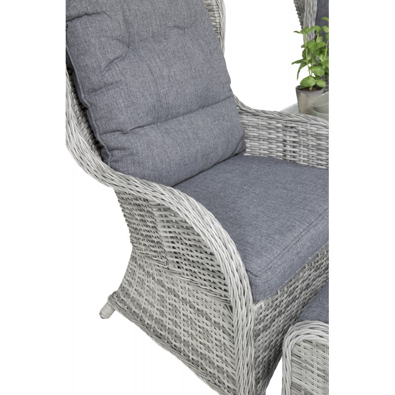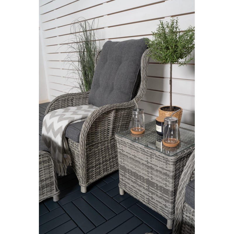 Luksusowy, wygodny i przyjemny - idealny zestaw wypoczynkowy z ekskluzywnym charakterem! Ten zestaw wypoczynkowy z serii Vikelund łączy ponadczasowy design z dobrym komfortem na patio. Zestaw wypoczynkowy składa się z dwóch foteli z ramą i niższego stolika kawowego ze szklanym blatem. Wykonany z jasnoszarego sztucznego rattanu z aluminiową ramą. W tym miękkie, grube ciemnoszare piklowane poduszki. Umebluj balkon i podnieś współczynnik przytulności na późne letnie wieczory! Porady dotyczące pielęgnacji: Konstrite to tworzywo sztuczne, które idealnie nadaje się do naszego skandynawskiego klimatu. Materiał jest odporny na promieniowanie UV i wytrzymuje pogodę i wiatr. Fakt, że jest odporny na promieniowanie UV oznacza, że meble nie blakną, jednak zawsze zalecamy przechowywanie mebli pod ochroną mebli lub w inny sposób w suchym i chłodnym miejscu - aby przedłużyć ich żywotność.