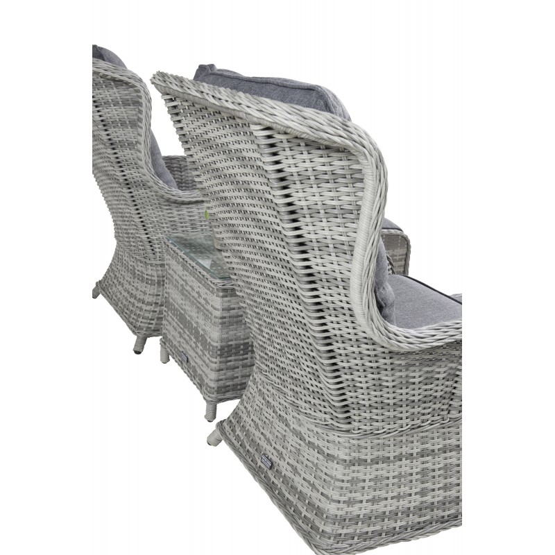 Przytulny szary zestaw kawiarniany o ładnym designie wykonany z wytrzymałego sztucznego rattanu, który idealnie pasuje do mniejszego patio. Zestaw kawiarniany składa się z dwóch krzeseł i stołu z towarzyszącą szklaną płytą, która jest odporna na pogodę i wiatr, schludne krzesła mają miękkie poduszki siedziska i można je łatwo wsunąć pod stół, co ułatwia...