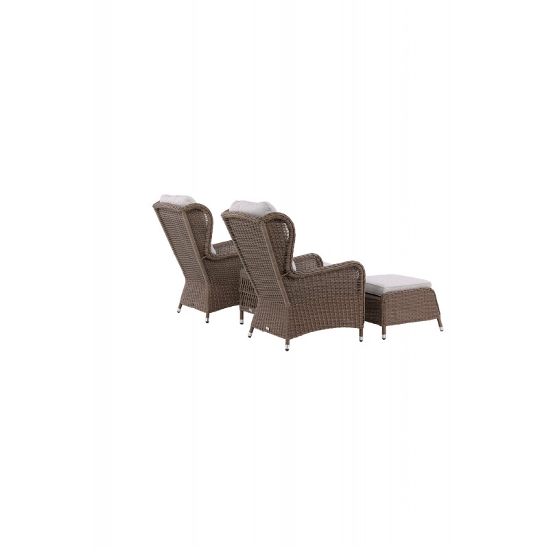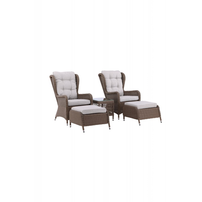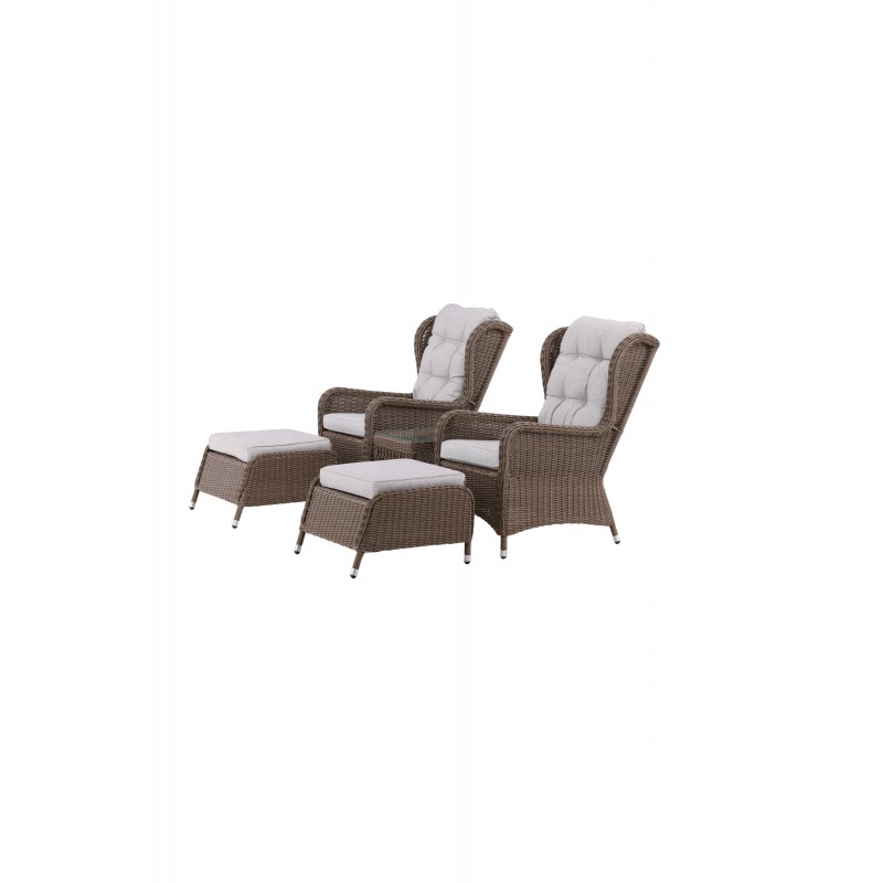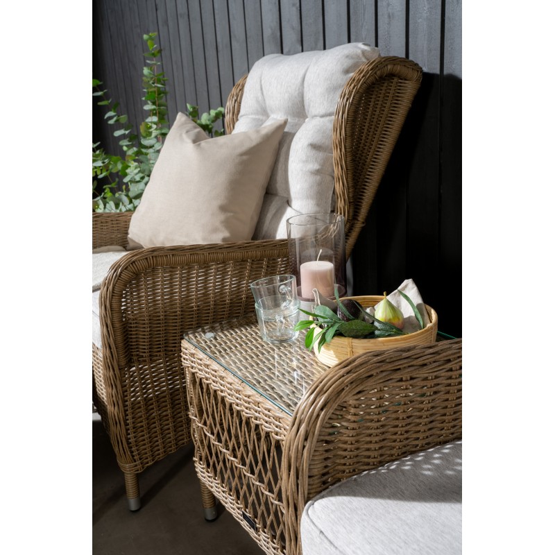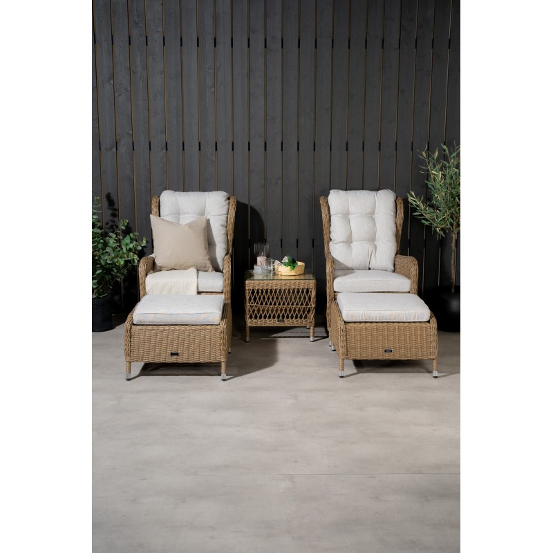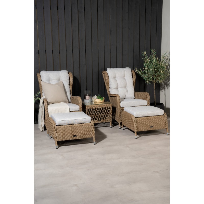 Washington to ekskluzywny zestaw wypoczynkowy łączący ponadczasowy design i fantastyczny komfort na patio lub tarasie. Zestaw wypoczynkowy składa się z dwóch foteli, dwóch podnóżków z miękkimi, piaskowymi, piklowanymi poduszkami i stolika bocznego ze szklanym blatem. Zestaw wypoczynkowy wykonany jest z aluminiowej ramy i naturalnego, kolorowego tworzywa sztucznego - tak samo trwałego, jak stylowego! Porady dotyczące pielęgnacji: Konstrite to tworzywo sztuczne, które idealnie nadaje się do naszego skandynawskiego klimatu. Materiał jest odporny na promieniowanie UV i wytrzymuje warunki atmosferyczne i wiatr. Fakt, że jest odporny na promieniowanie UV oznacza, że meble nie blakną, jednak zawsze zalecamy przechowywanie mebli pod osłoną mebli lub w innym suchym i chłodnym miejscu - aby przedłużyć ich żywotność.